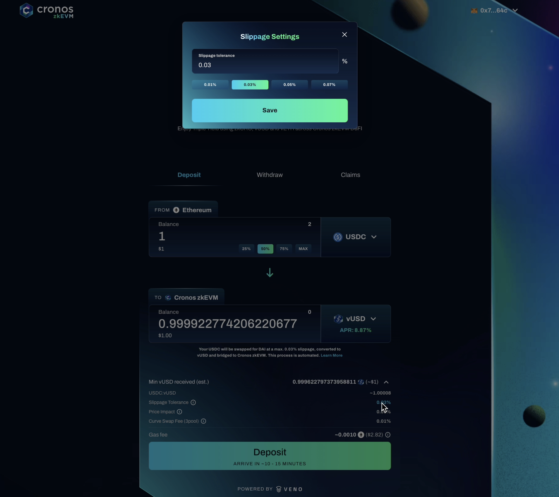 4\. Under the hood, the bridge will swap the USDC for DAI for you before it deposits it into vUSD. Check that the slippage, price impact, and min received amount are to your liking. You may change the slippage by clicking on it.