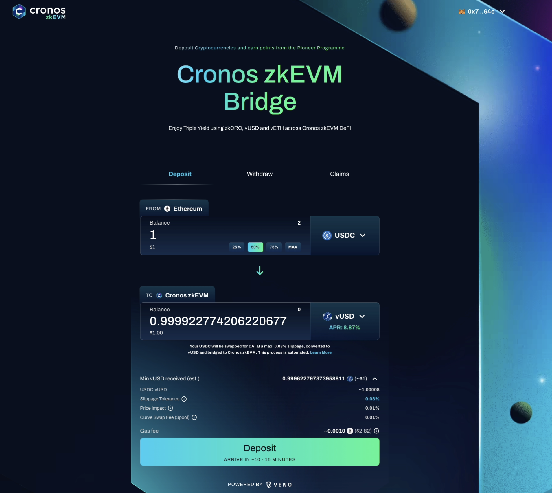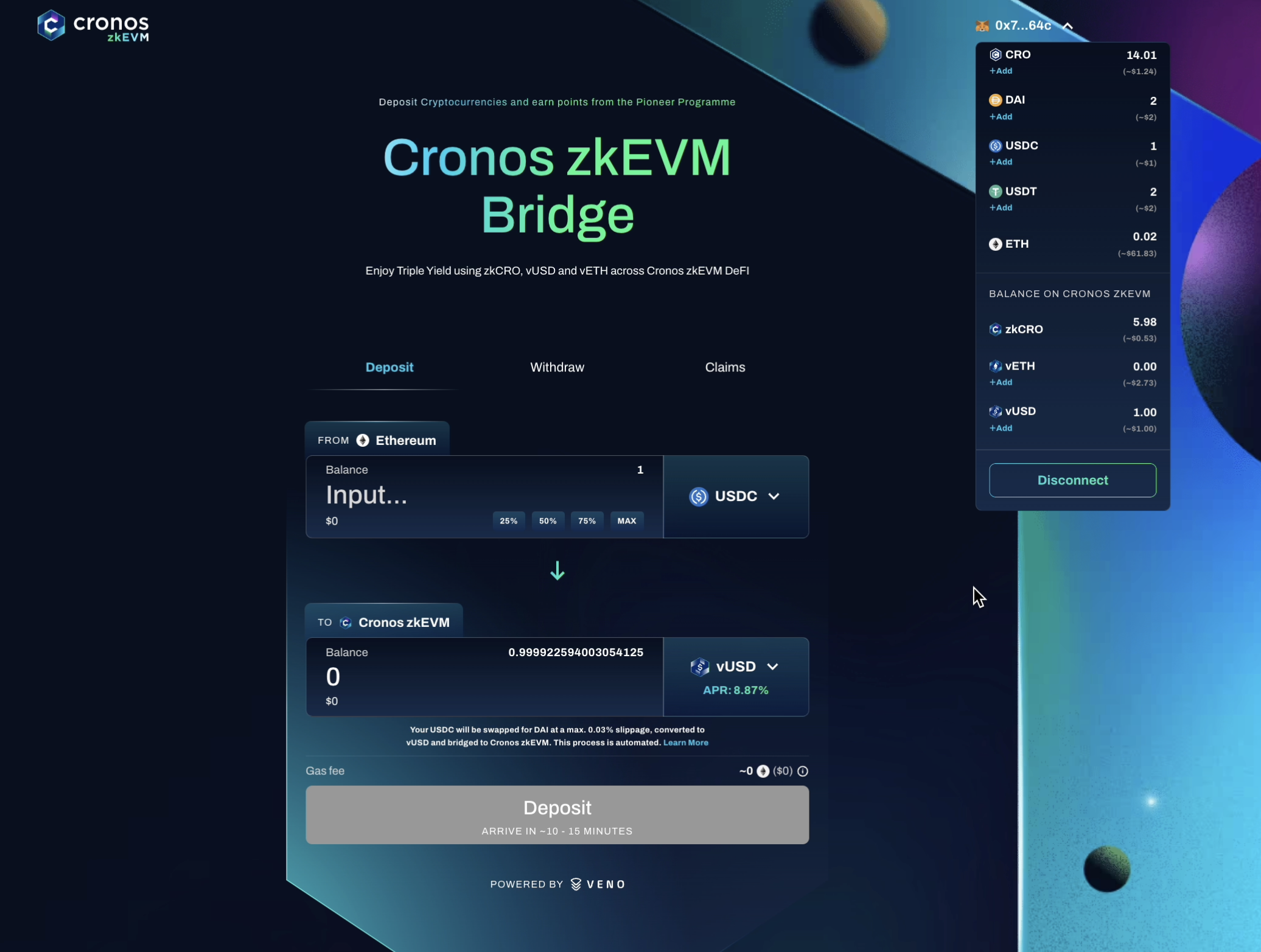 vUSD can be used across the Cronos zkEVM Ecosystem. It is pegged 1:1 to USD but you can earn yield just by holding it. Depositing USDC also earns you points in the [pioneer program](https://blog.cronos.org/p/announcing-the-cronos-zkevm-pioneer).