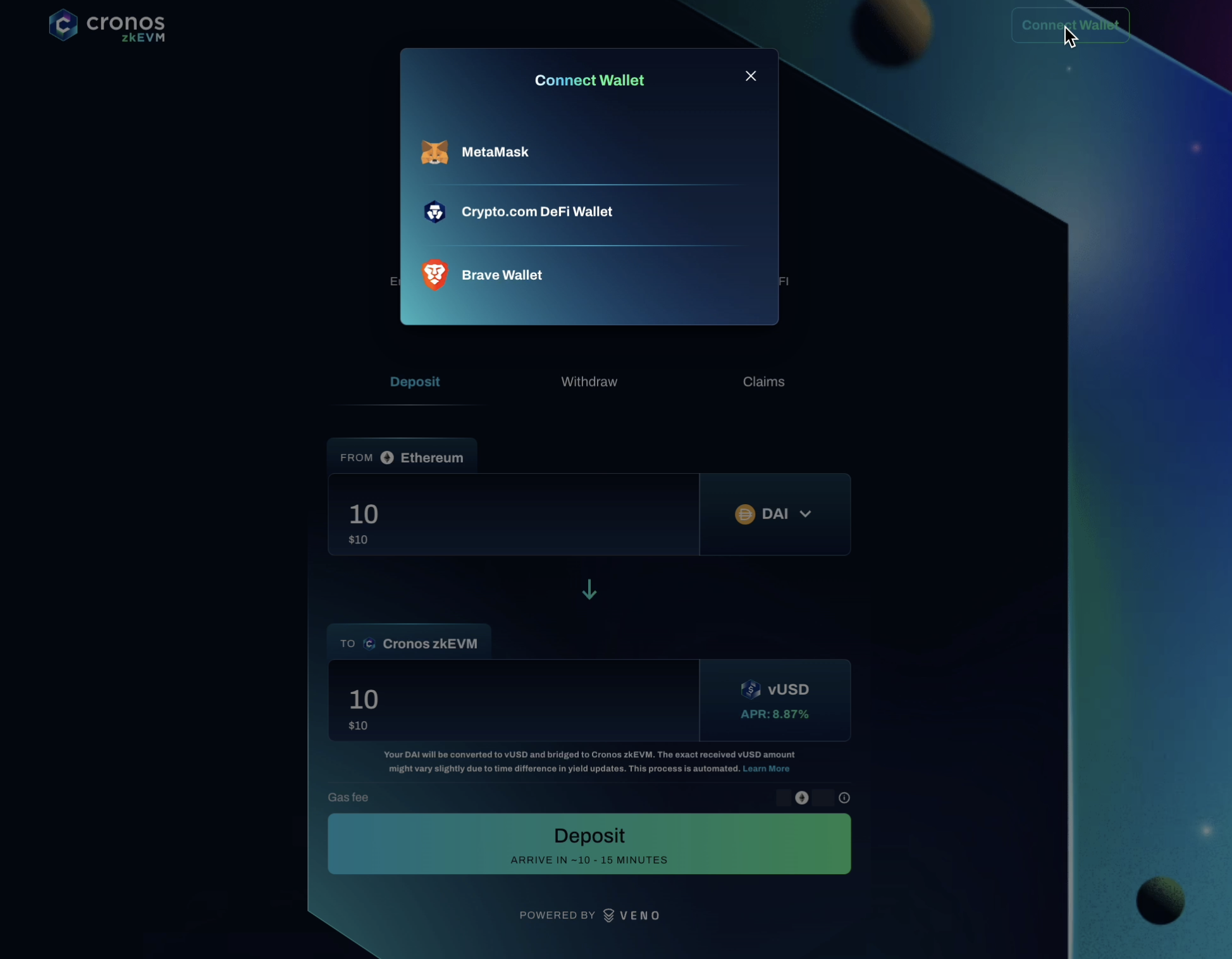 1\. Head to <https://zkevm.cronos.org> and connect your wallet.