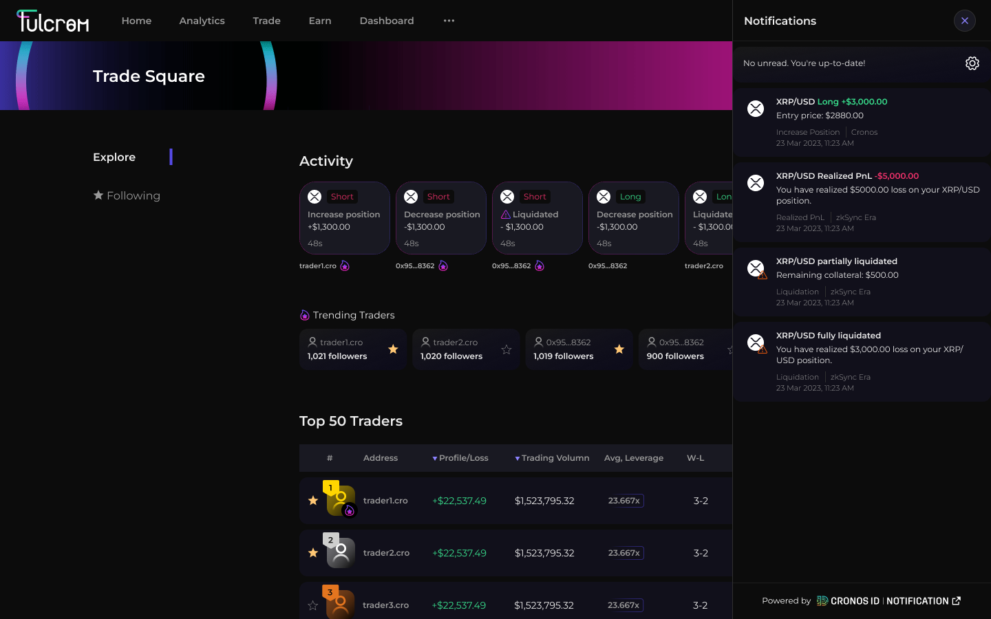 View all your trade notifications from both the Cronos and zkSync Era chains in one centralized board on Telegram and Fulcrom website.